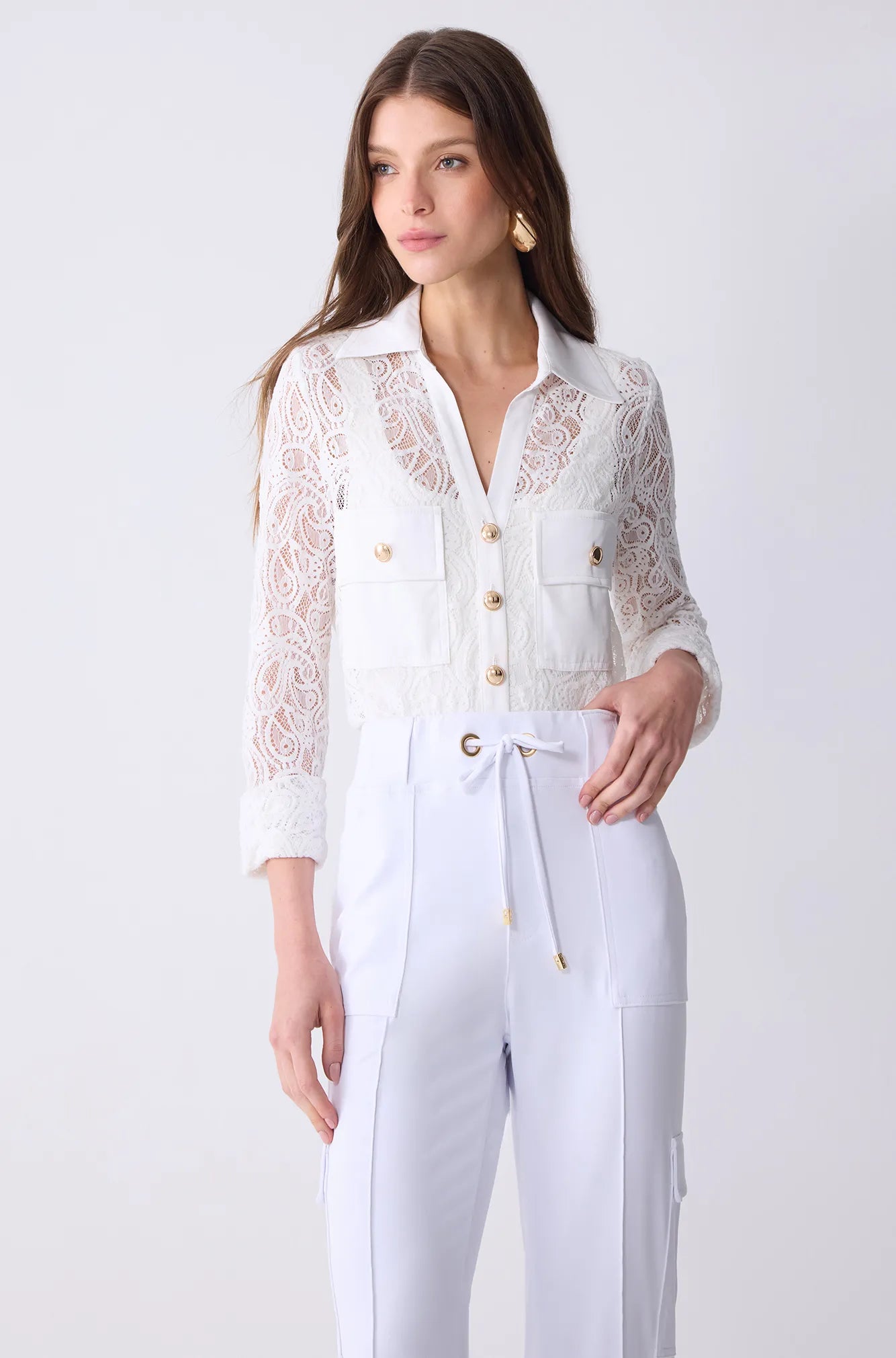 Camisa em off white com detalhes em renda e acabamentos dourados que elevam o visual com um toque de luxo discreto. A combinação de renda e elementos gold confere sofisticação e feminilidade à peça, criando um contraste elegante com a base neutra. O modelo funciona tanto como peça de destaque quanto como layer versátil em diferentes composições. Ideal para quem aprecia detalhes refinados e busca peças que transitam entre o casual e o formal com naturalidade.