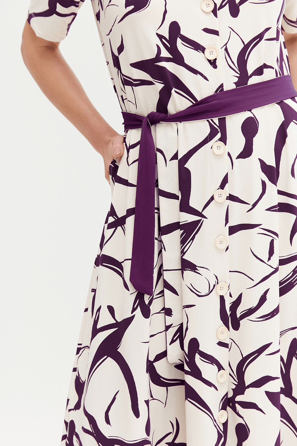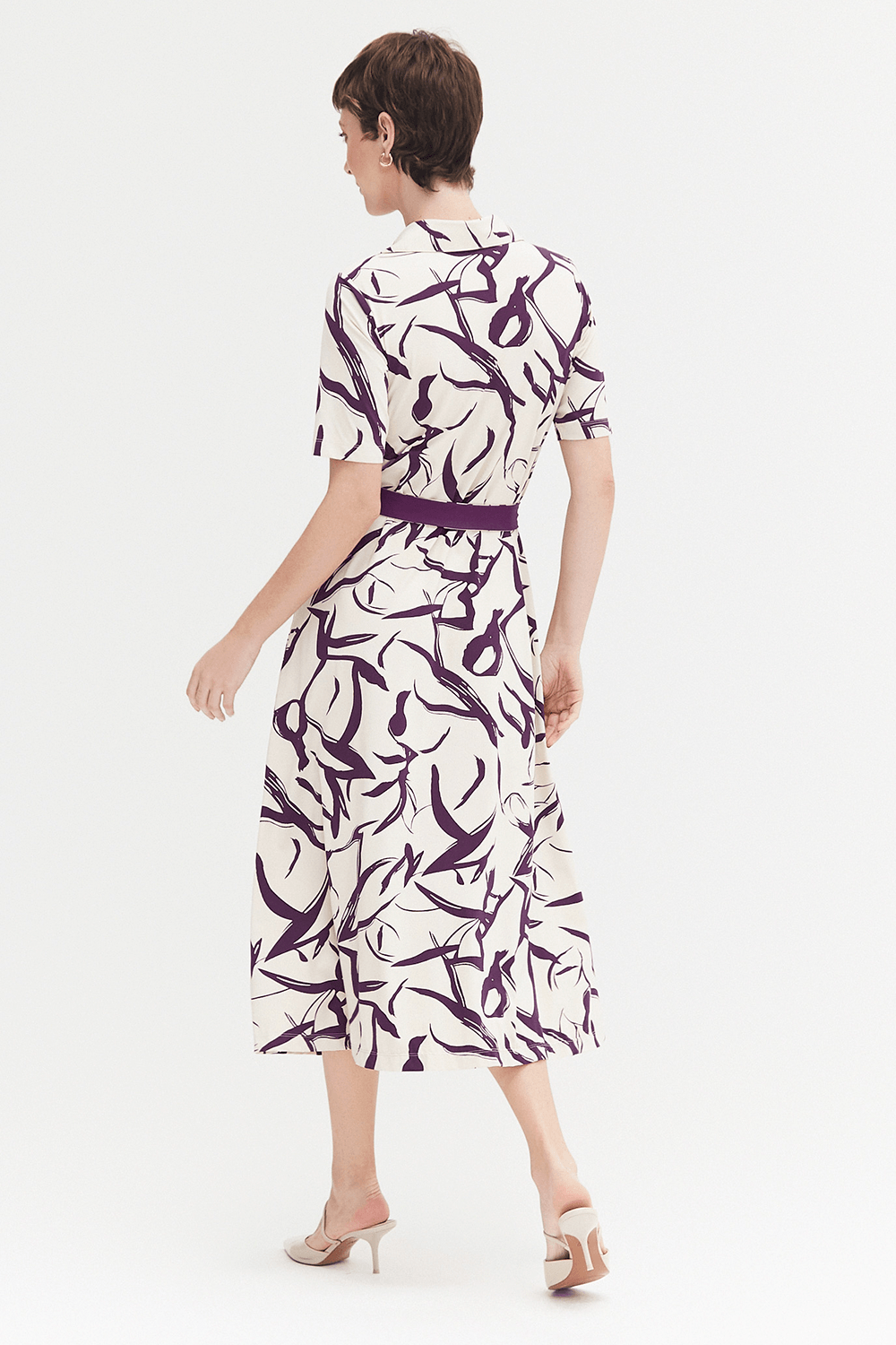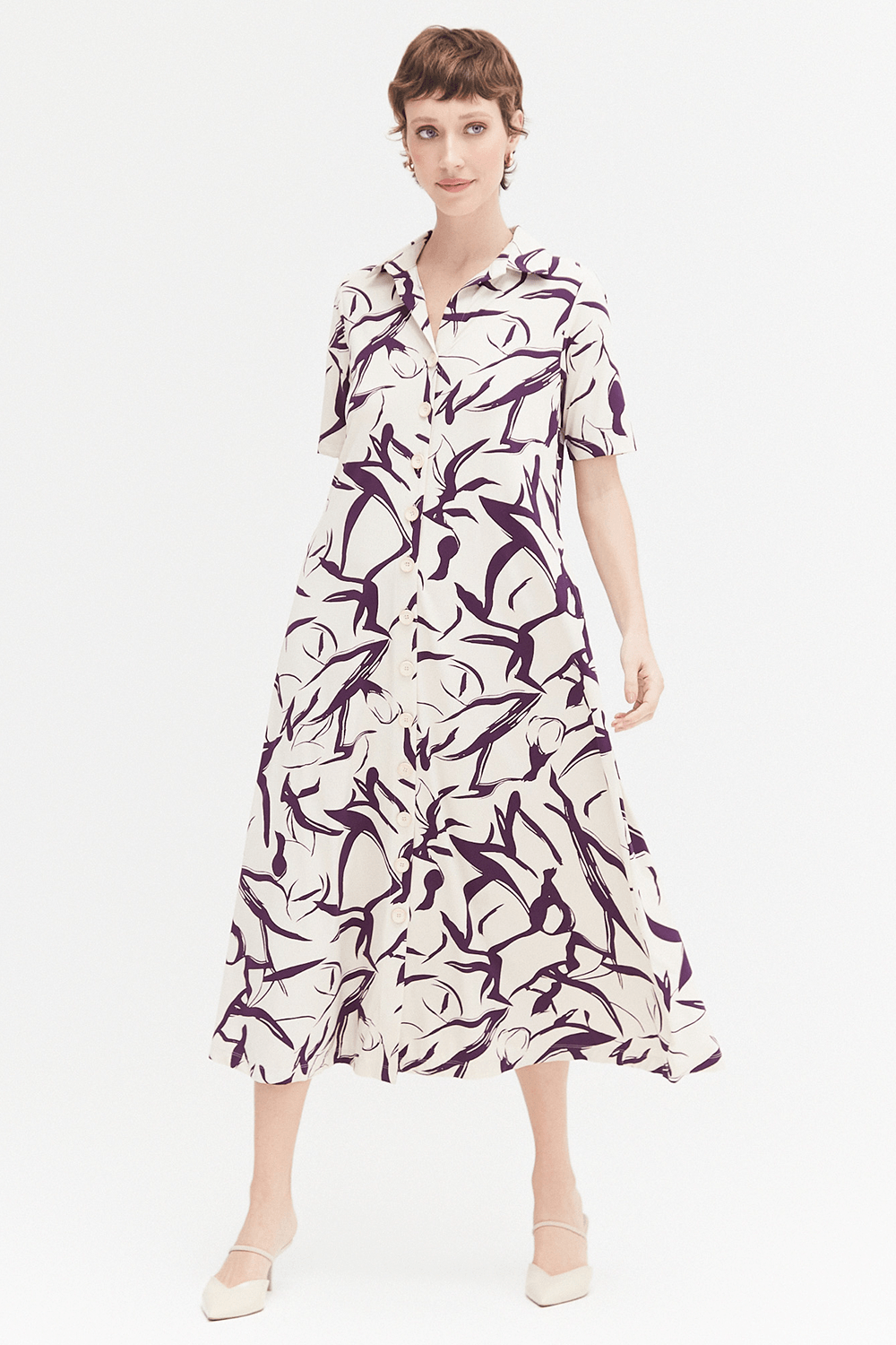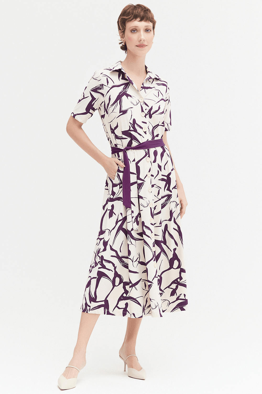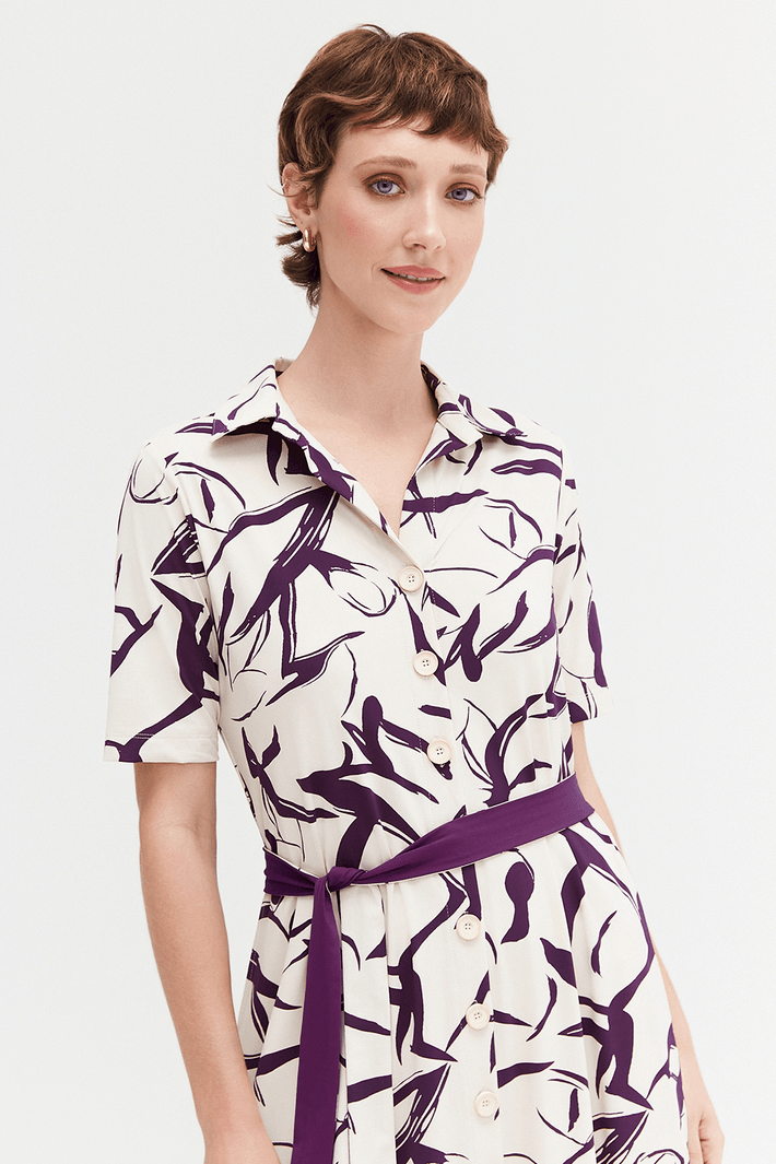Elegante chemisier midi com mangas 1/2 e estampa exclusiva em tons de Macedonia e Beringela. Perfeito para diversas ocasiões, este vestido combina conforto e estilo, valorizando sua silhueta com um caimento fluido e sofisticado. Ideal para compor looks versáteis do dia a dia ao casual chic.