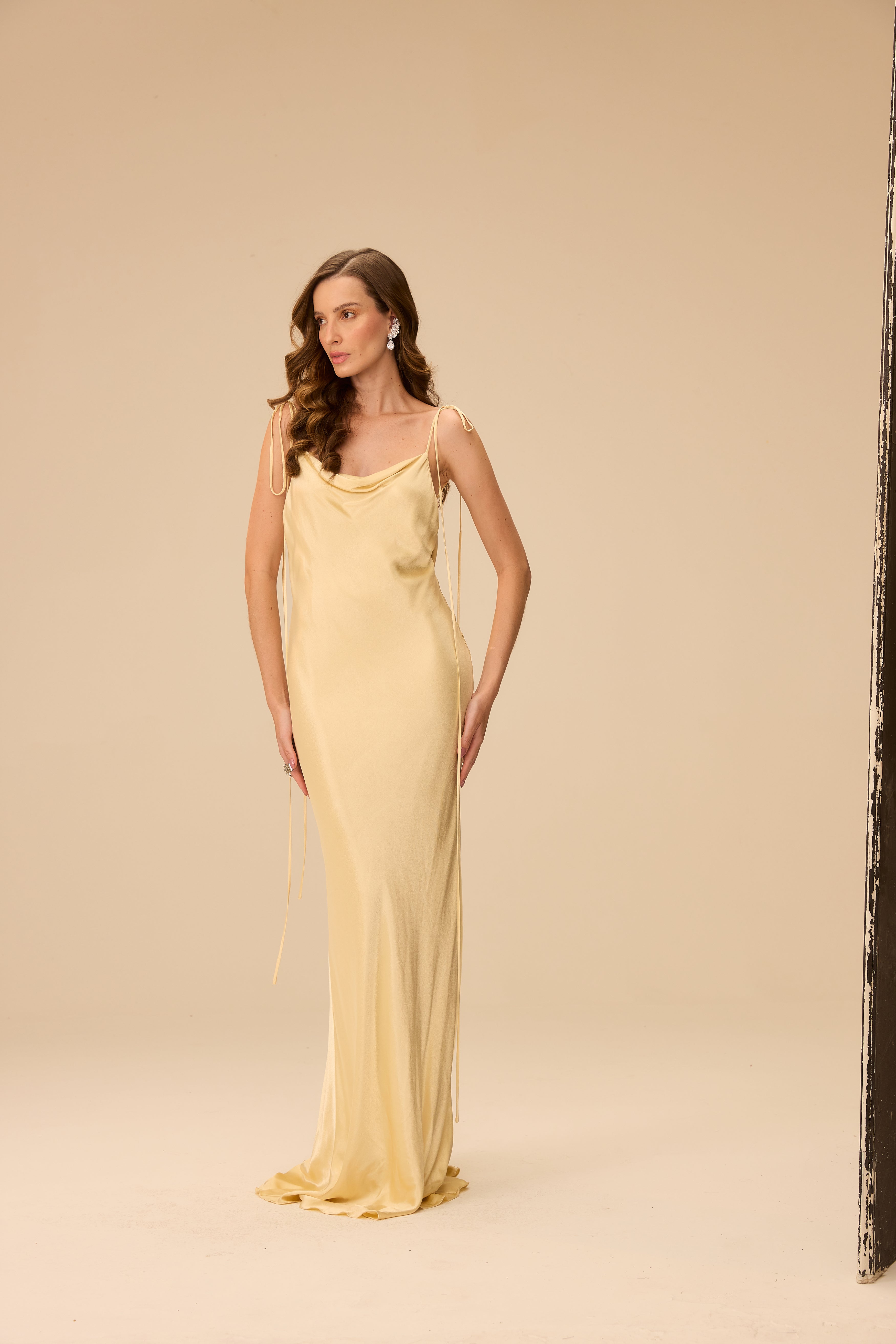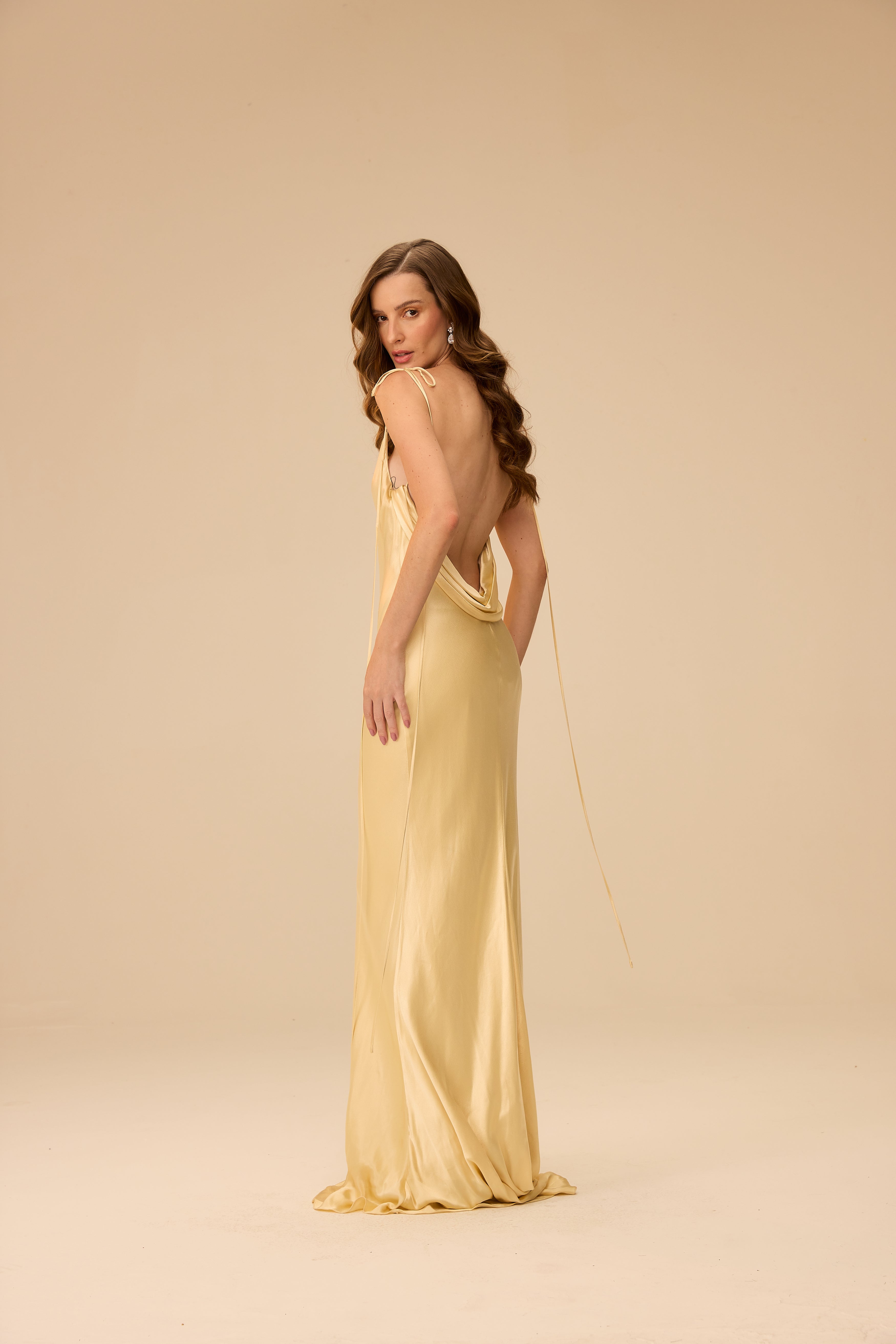 O vestido VICTOR DZENK em cetim rayon amarelo apresenta um decote nas costas com drapeado que realça a elegância da peça. Seu tecido leve e com brilho sutil proporciona caimento fluido e conforto, ideal para ocasiões que pedem sofisticação e estilo contemporâneo. Uma escolha refinada para quem valoriza design e qualidade.