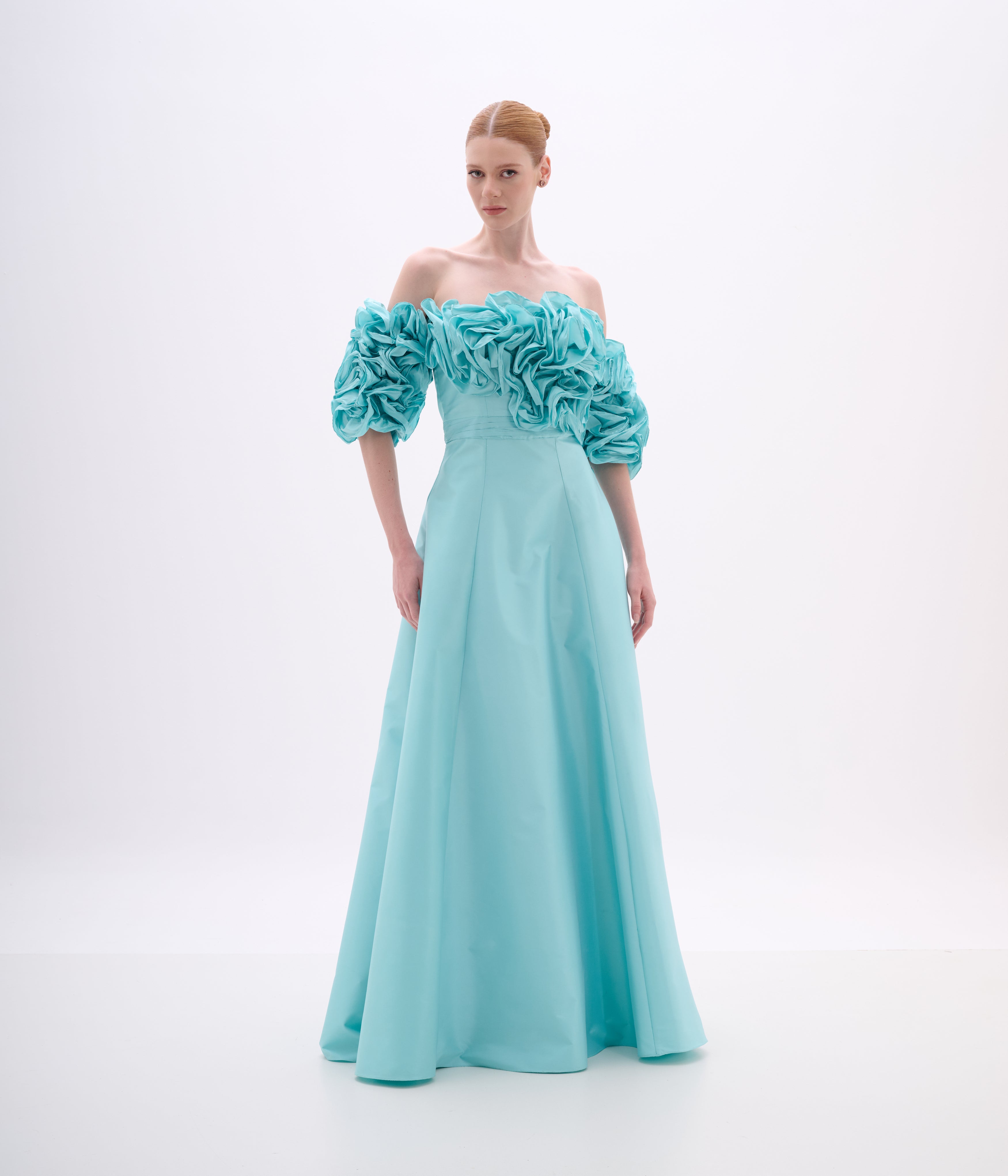 O Vestido Moulage Manga Tafetá da ARTE SACRA na cor Acqua combina a técnica moulage com mangas estruturadas em tafetá, resultando em uma peça elegante e contemporânea. Seu caimento preciso valoriza a silhueta, enquanto o tecido de alta qualidade oferece conforto e sofisticação. Ideal para eventos que exigem um visual marcante e refinado, este vestido reflete a excelência e o cuidado característicos da marca.