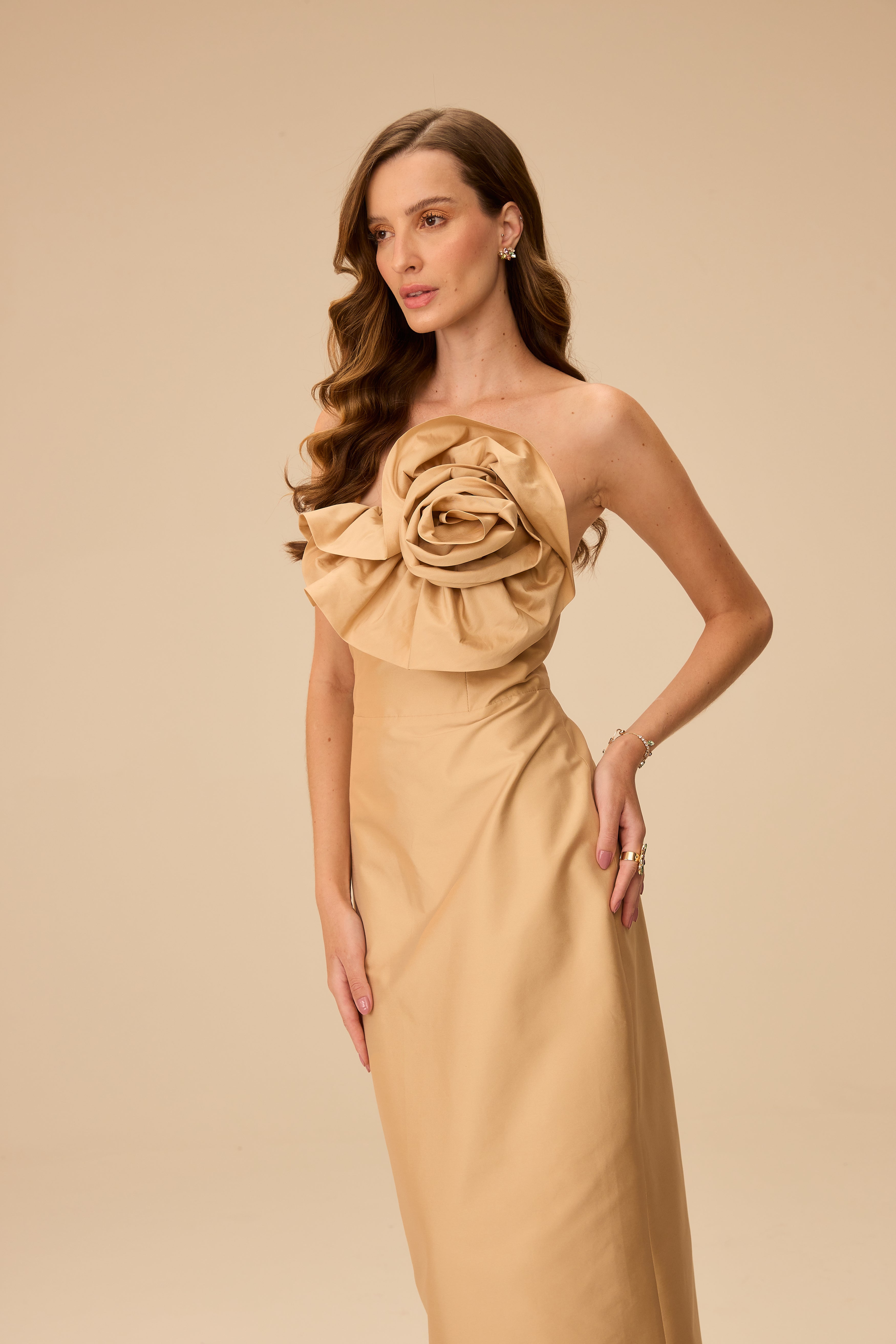 O vestido VICTOR DZENK em tafetá bege destaca-se pelo design tomara-que-caia com detalhe floral no decote, que confere delicadeza e sofisticação à peça. Seu tecido estruturado proporciona caimento elegante e conforto, ideal para eventos que exigem um visual refinado e contemporâneo. Uma escolha perfeita para quem busca aliar estilo exclusivo e qualidade superior.