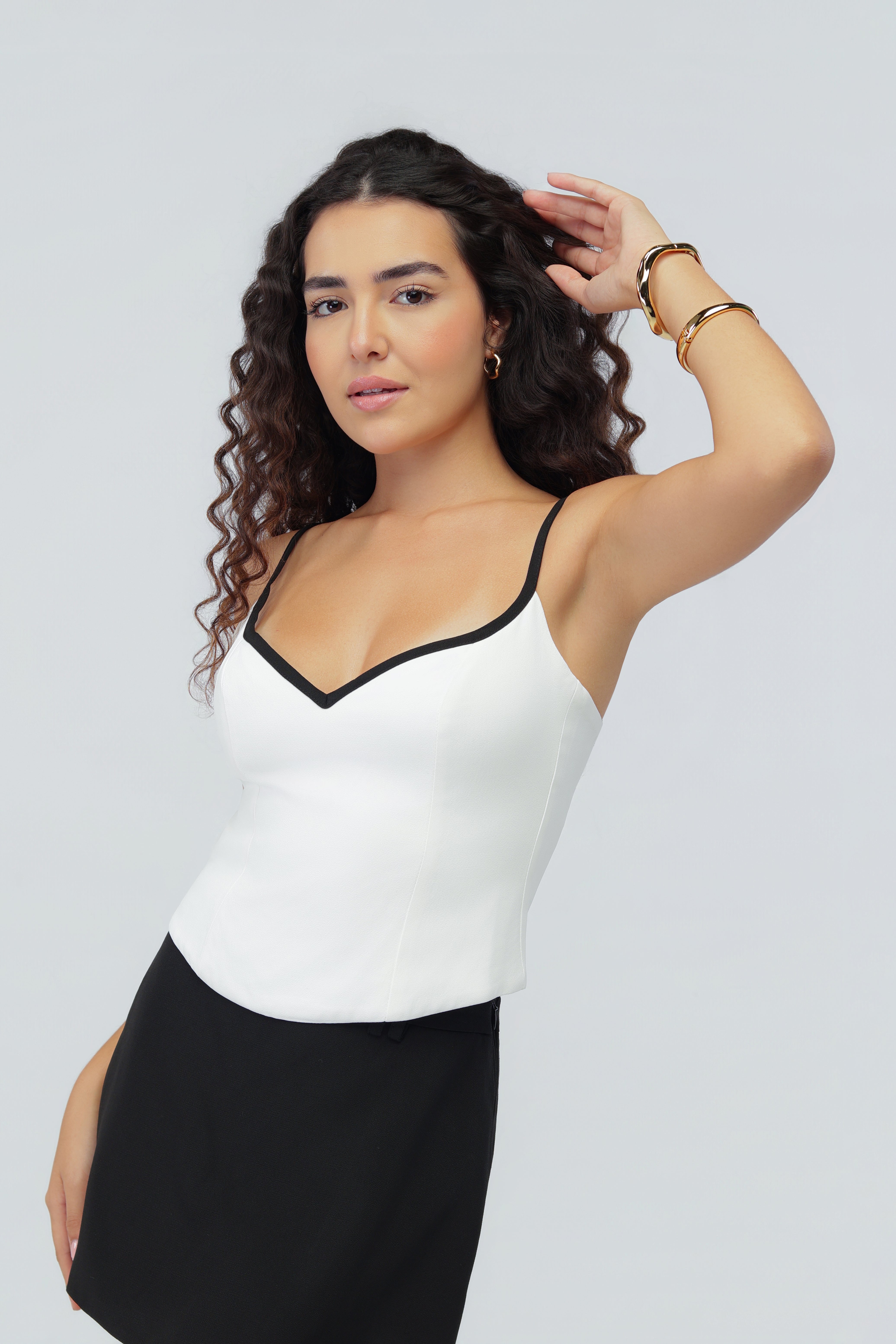 VITORIA VARGAS - Top Stella Crepe OFF White com Vies Preta Elegância minimalista em crepe de qualidade premium. Este top Stella apresenta um design limpo em off-white, realçado pelo detalhe sofisticado do vies preto que define o decote e as laterais. O tecido crepe oferece estrutura e movimento, criando uma silhueta refinada que funciona tanto em looks casuais quanto em composições mais elaboradas. Versátil e atemporalidade garantida, é a peça essencial que toda mulher precisa no guarda-roupa.