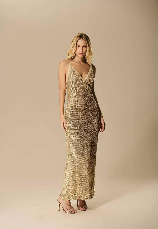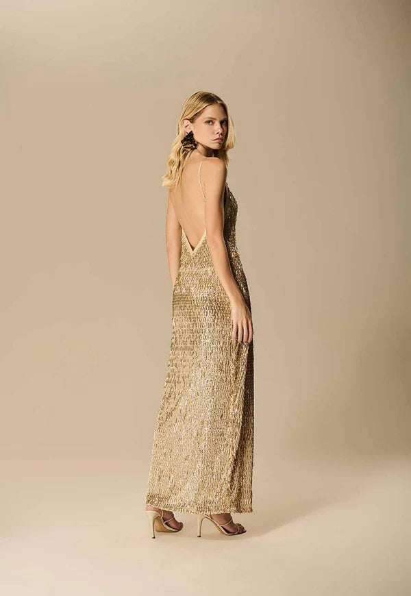 CAOS - Vestido Longo Decote V Paete Vidrilho