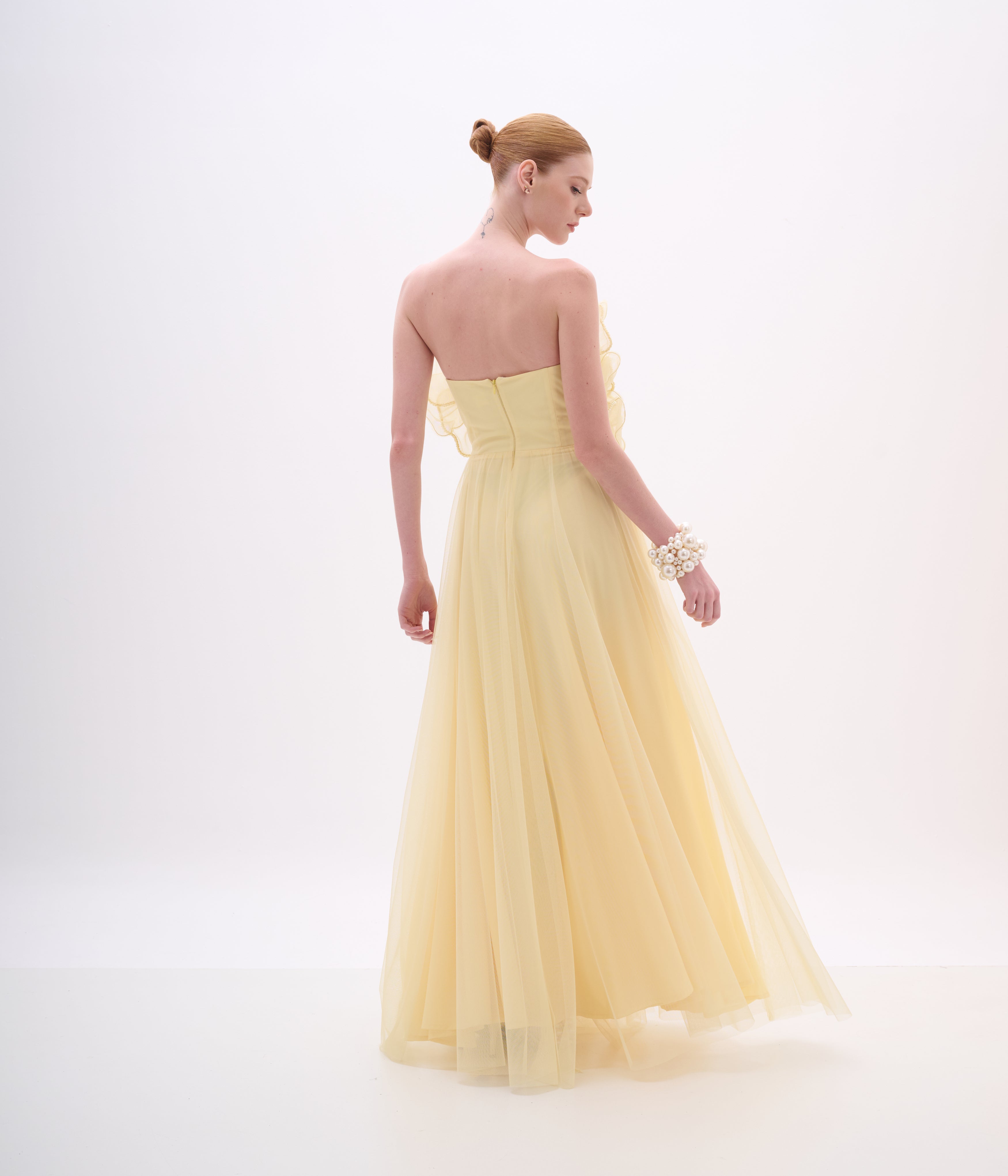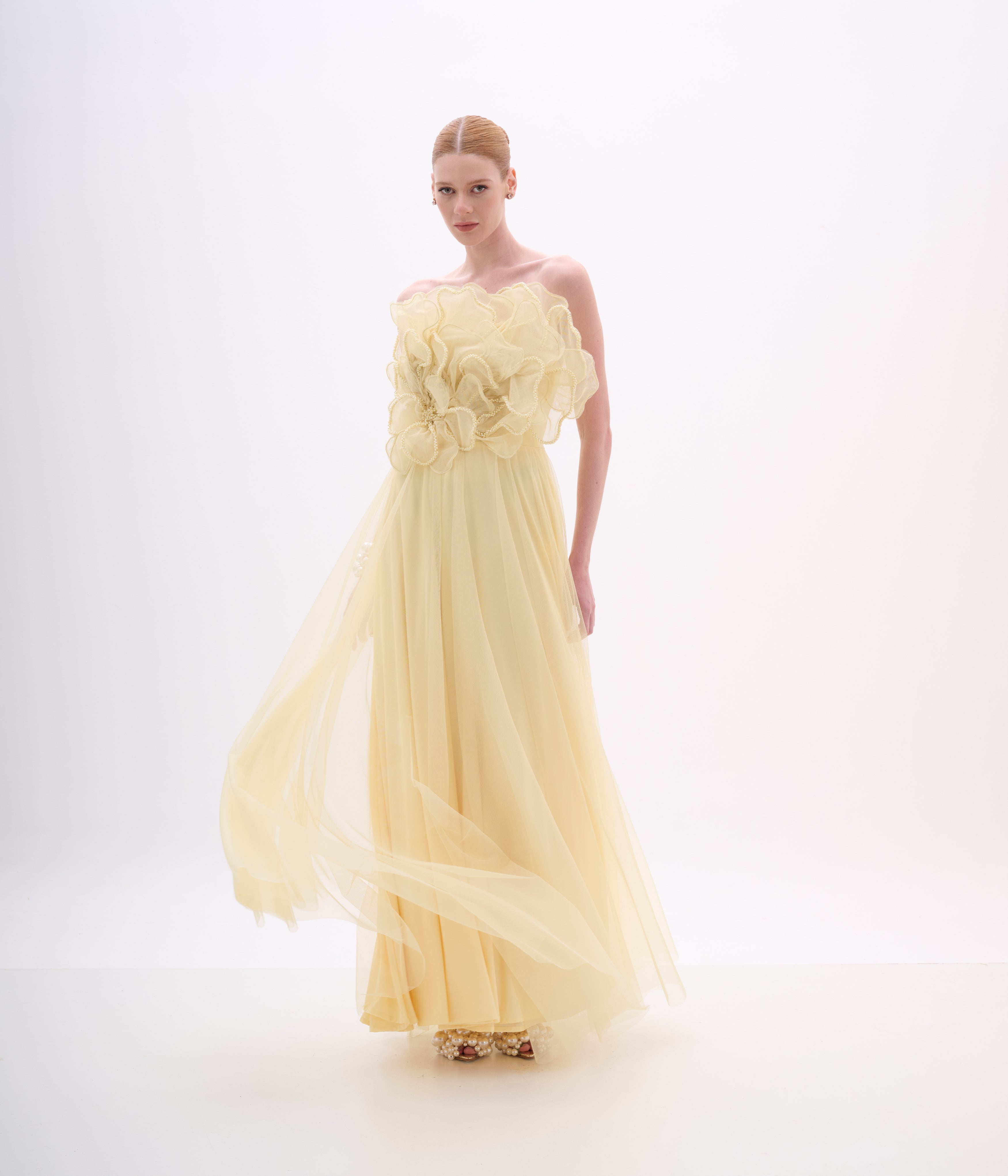 ARTE SACRA - Vestido Longo Pétalas Bordadas Tule Dress Yellow Cream